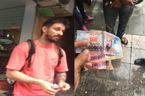 Vị khách Tây với số tiền âm phủ được trả lại sau khi đi xích lô. Ảnh: Lao Động |
