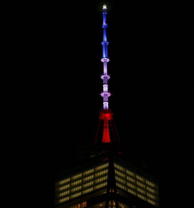 Tòa tháp One World Trade Centre ở NewYork, Mỹ, được thắp sángtrongmàuxanh, trắng vàđỏ của lá cờPhápđể tưởng niệmcác nạn nhân củacác cuộc tấn côngởParis. - Ảnh: Reuters |
