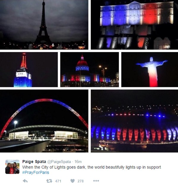 Thế giới đã cùng nhau để dòng chữ#prayforparis,bao gồm cảnhững người nổi tiếng trên các mạng xã hội.Ngoài ra, các địa danh nổi tiếngtrên toànthế giới đã đượcthắp sángtrongmàu sắc lá cờquốc gia của Pháp,đểtỏ lòng tôn kínhđến các nạn nhâncủa thảm kịch khủng bốParis.