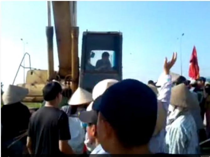 Những người lạ mặt chửi bới, đe dọa người dân. Bị người dân chặn lại, người thợ lái máy xúc dừng xe. Lúc đó, một người đàn ông lạ mặt nhảy lên cabin yêu cầu người thợ lái máy xúc hướng dẫn anh ta cách vận hành. Khi người thợ lái máy xúc nhảy xuống thì người đàn ông lạ mặt kia điều khiển máy xúc tiến lên.
