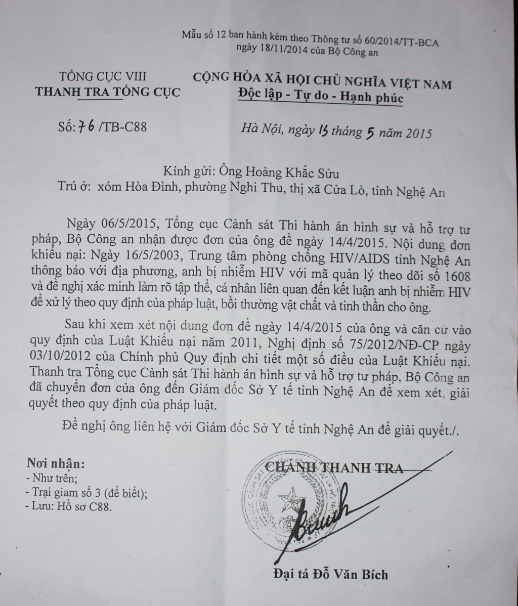 “Ngày 6/5/2015, Tổng cục Cảnh sát Thi hành án hình sự và hỗ trợ tư pháp, Bộ công an nhận được đơn của ông (Hoàng Khắc Sửu) đề ngày 14/4/2015. Nội dung đơn khiếu nại: Ngày 16/5/2003, Trung tâm phòng chống HIV/AIDS tỉnh Nghệ An thông báo với địa phương, anh bị nhiễm HIV với mã quản lý theo dõi số 1608 và đề nghị xác minh làm rõ tập thể, cá nhân liên quan đến kết luận anh bị nhiễm HIV để xử lý theo quy định của pháp luật, bồi thường vật chất và tinh thần cho ông.
