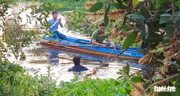 Lực lượng chức năng tìm kiếm vật chứng liên quan đến vụ án tại con kênh thuộc xã Phú Hòa Đông (huyện Củ Chi). Ảnh: Tuổi Trẻ |