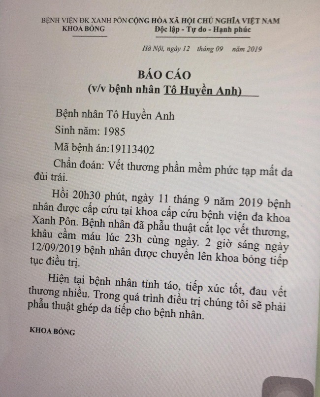 Tại khoa cấp cứu bệnh nhân được cắt bỏ tổ chức dập nát và cầm máu... Đến khoảng 2h ngày 12/9 thì bệnh nhân được chuyển lên khoa Bỏng điều trị tiếp.
