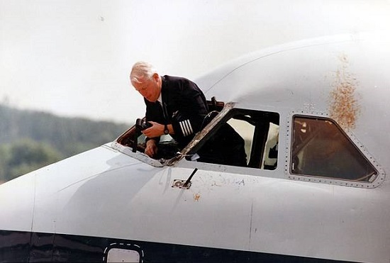 Lúc này, Cơ trưởng Tim Lancaster bị hút nửa người ra ngoài cửa sổ, hai chân kẹp chặt vào thiết bị điều khiển bay.
