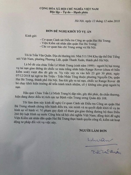 Liên quan đến vụ việc tài xế Range Rover đâm nữ sinh dập não rồi bỏ chạy ở Hà Nội, mới đây, trao đổi với TTXVN, ông Trần Văn Quân (trú ở nhà 511/194 Khu tập thể Đài Tiếng nói Việt Nam) là bố đẻ em Trần Lê Minh Trang cho hay, ông đã có đơn thư đề nghị Cơ quan Điều tra Công an quận Hai Bà Trưng; VKSND quận Hai Bà Trưng khởi tố vụ ô tô Range Rover về hành vi vượt đèn đỏ, gây tai nạn nghiêm trọng cho em Trang.