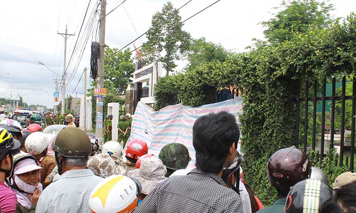 Công an căng bạt che thi thể của nạn Dư Minh Vỹ, được tìm thấy gần hàng rào. |