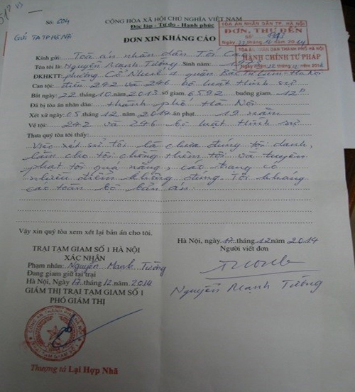 Trở lại đơn kháng cáo của bị cáo Nguyễn Mạnh Tường gửi TAND TP. Hà Nội, theo ghi nhận của một cán bộ TAND TP. Hà Nội, đây là một tờ đơn kháng cáo độc nhất vô nhị, bởi nội dung chỉ vỏn vẹn 5 dòng chữ viết nguệch ngoạc, thể hiện tâm trạng không được tốt của người viết. Bị cáo Tường kháng cáo toàn bộ bản án, cho rằng toà (TAND TP. Hà Nội) xử chưa thoả đáng, khiến tội chồng tội, cáo trạng có nhiều điểm chưa đúng và mức án với Tường là quá nặng.