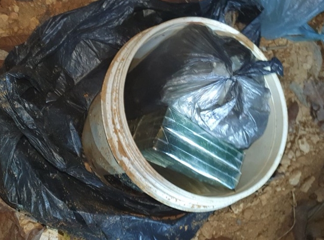 Tại nhà Khánh, lực lượng chức năng nhận định có thể đối tượng chôn giấu ma túy dưới vườn nên tổ công tác đã quyết định đào các vị trí nghi ngờ lên.Qua đó phát hiện, thu giữ 13 bánh heroin, 7kg ma túy đá, 10.000 viên ma túy tổng hợp được đối tượng bọc trong nilon, giấu trong các thùng sơn chôn dưới gốc cây tiêu trong vườn nhà.
