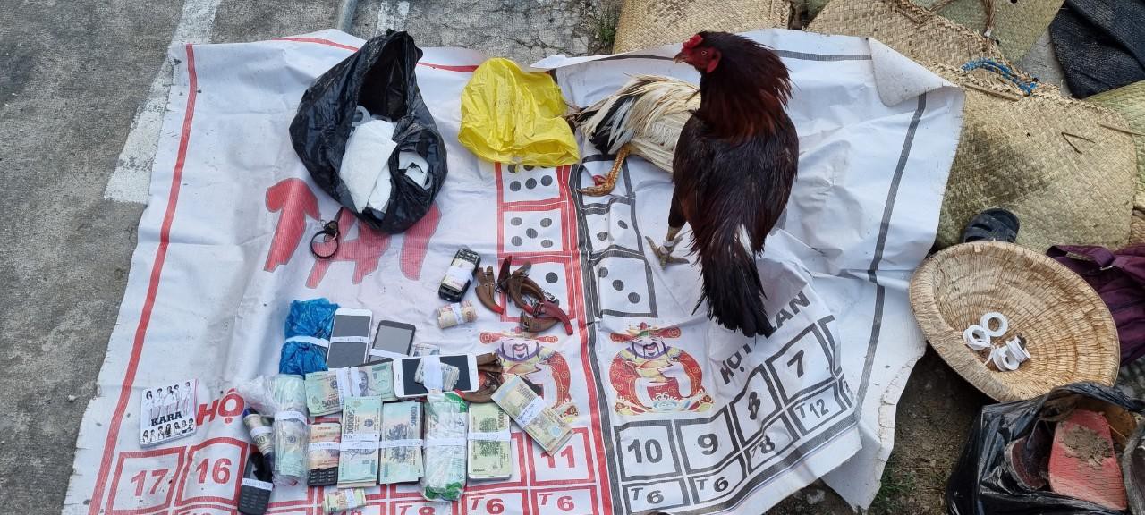 Tại hiện trường xảy ra sự việc, công an bắt giữ 18 người, tạm giữ 8 con gà đá, hơn 100 triệu đồng cùng bốn xe máy và nhiều vật dụng phục vụ cho việc đá gà, cờ bạc.