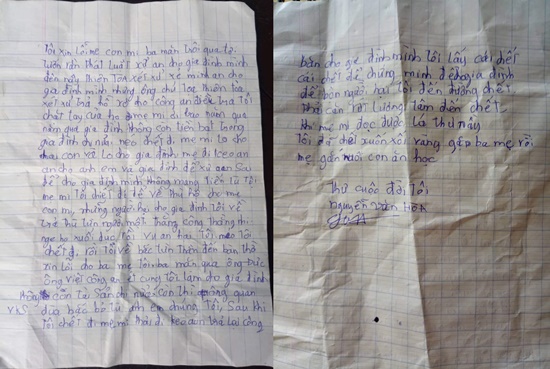 Bức thư tuyệt mệnh anh Hòa để lại trước khi tự tử. Ảnh: Công Lý |