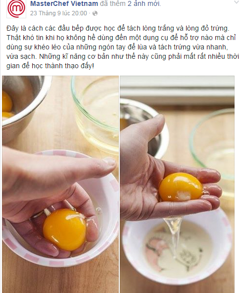 Trên trang Fanpage chính thức của chương trình chia sẻ hình ảnh tách lòng đỏ trứng bằng tay cùng dòng trạng thái có nội dung: “Đây là cách các đầu bếp được học để tách lòng trắng và lòng đỏ trứng. Thật khó tin khi họ không hề dùng đến một dụng cụ để hỗ trợ nào mà chỉ dùng sự khéo léo của những ngón tay để lùa và tách trứng vừa nhanh, vừa sạch. Những kĩ năng cơ bản như thế này cũng phải mất rất nhiều thời gian để học thành thạo đấy!”.