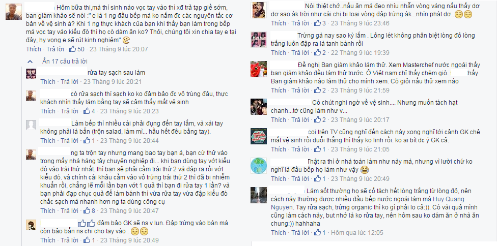 Một bạn khác cũng phản đối cách tách trứng này vì mất vệ sinh không kém các thí sinh mà giám khảo thẳng tay loại ở tập 13 Vua đầu bếp: “Hôm bữa thi mà thí sinh nào vọc tay vào thì phải trả tạp dề sớm, ban giám khảo sẽ nói em là 1 người đầu bếp mà ko nắm được các nguyên tắc cơ bản về vệ sinh à? Khi 1 người thực khách của bạn thấy bạn làm trong bếp mà vọc tay vào kiểu đó thì họ có dám ăn không? Thôi, chúng tôi xin chia tay em tại đây, hy vọng em sẽ rút kinh nghiệm”.