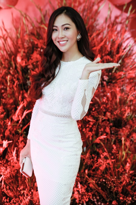 Diệu Ngọc khoe đường cong trong dáng váy cocktail ôm sát trên nền chất liệu ren xuyên thấu mỏng manh. Sắc trắng tinh khôi mang lại vẻ ngoài tươi trẻ cho Hoa khôi Áo dài Việt Nam 2016. Sự kiện còn có sự tham dự của: Diễm My, Diệu Nhi, Nam Thư, vợ chồng Lý Hải Minh Hà, Trang Khiếu, Sĩ Thanh,…