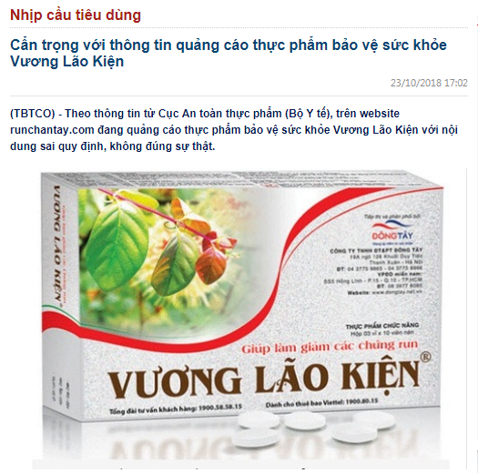 | Thông tin của Cục ATTP về sản phẩm Vương Lão Kiện. |