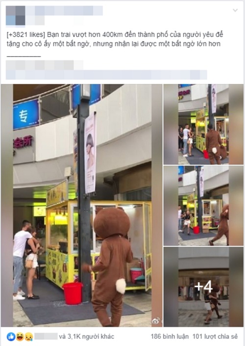 Biết người yêu đang đi chơi nên anh đã đóng giả một chú gấu để xuất hiện thật ấn tượng.