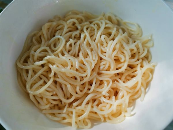 - Lấy mì ra, để ráo mì, cho chúng vào một cái bát lớn, thêm nửa muỗng dầu trong và trộn đều, để mì không bị dính vào nhau, chúng cũng sẽ không dính vào nhau khi xào. Nó cũng không còn gây sát chảo.