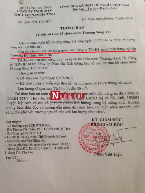 Cho rằng đây là một điều bất thường, báo Người Đưa Tin tiếp tục có cuộc trao đổi với lãnh đạo công ty Công ty TNHH MTV Thủy lợi Nam Hà Tĩnh, là đơn vị quản lý con đập. Qua đó nhận được nội dung văn bản số 344/TB – TLNHT do ông Phan Viết Liệu, Phó Giám đốc Công ty ký. Nội dung trong văn bản này nêu rõ 2 căn cứ về việc xả nước, 1 là do mực nước và 2 là do nhu cầu của Formosa (?!).