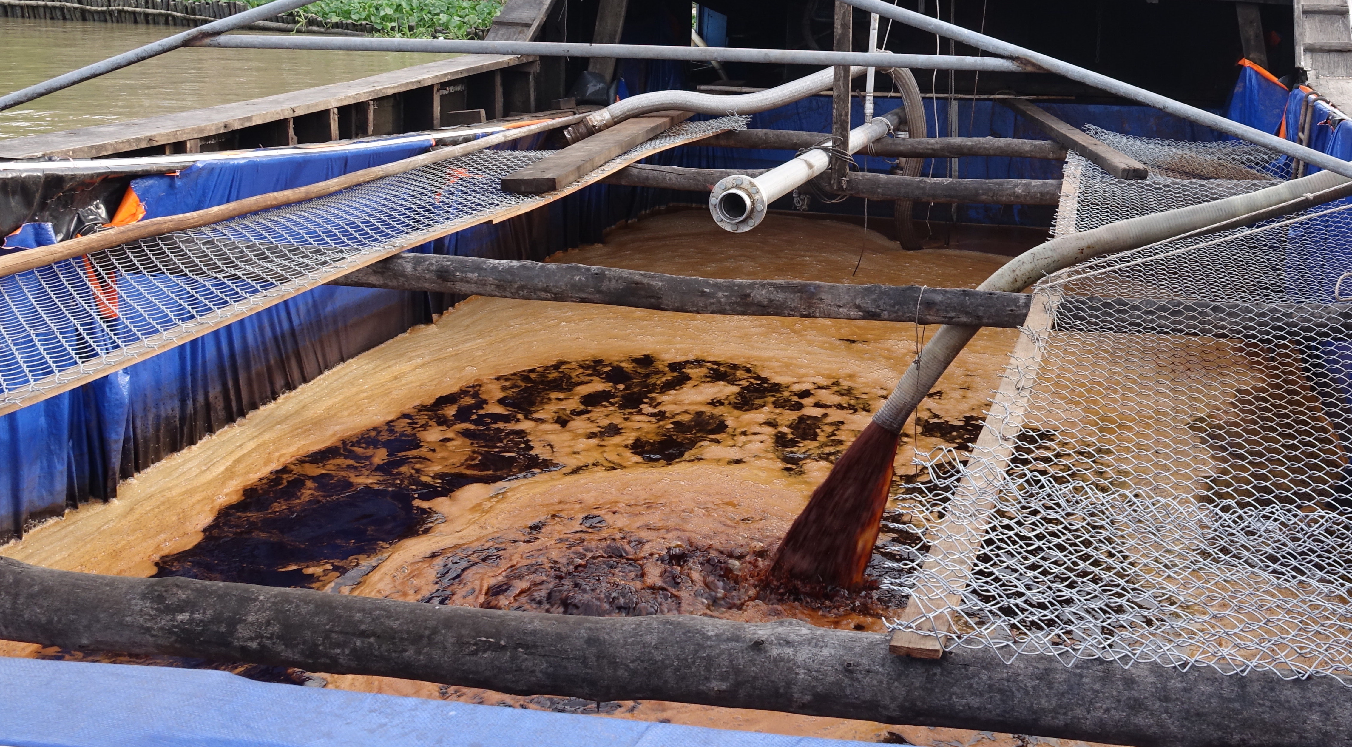 Nước thải từ Công ty Huy Việt – Tây Đô đang bơm xuống ghe để chở qua Đồng Tháp. Ảnh: Thanh niên. |