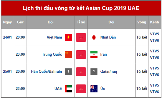 Lịch thi đấu vòng tứ kết Asian Cup 2019 - Ảnh: Vietnamnet |