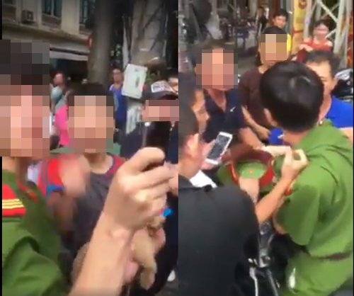 Nam thanh niên mặc quần áo công an, có biểu hiện say rượu, bị người dân vây, đánh tại Hà Nội.