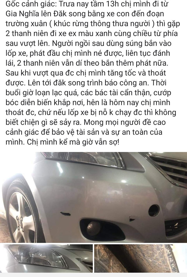 Mới đây, thông tin trên địa bàn tỉnh Đắk Nông, có 2 đối tượng đi trên xe máy bám theo nổ súng bắn vào lốp xe con đang lưu thông trên đường để cướp được đăng tải trên mạng xã hội Facebook khiến dư luận không khỏi xôn xao.