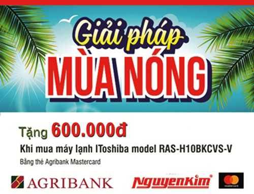 Tiếp tục chuỗi ưu đãi “Giải pháp mùa nóng”, từ ngày 21/04/2017 đến hết ngày15/05/2017, Quý khách hàng mua lẻ là chủ thẻ Agribank Mastercard mua hàng trực tiếp tại các STĐM Nguyễn Kim sẽ được giảm 600.000 VND khi mua máy lạnh Toshiba model RAS-H10BKCVS-V và thanh toán 100% bằng thẻ Agribank Mastercard. Mỗi khách hàng là chủ thẻ Agribank Mastercard chỉ được nhận ưu đãi 1 lần cho 1 sản phẩm trong suốt chương trình.