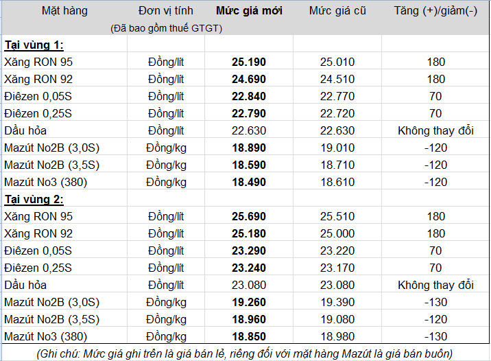 Dầu diesel (0.05S) tăng 70 đồng, lên 22.840 đồng/lít. Dầu mazut giảm 120 đồng, về 18.890 đồng/kg. Dầu hỏa không điều chỉnh giá.