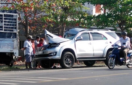 Tại hiện trường, phần đầu chiếc xe 7 chỗ bị hư hỏng nặng, kính xe bên phải bị vỡ nát, phần đuôi chiếc xe tải thì bị móp méo, hai xe dính vào nhau.