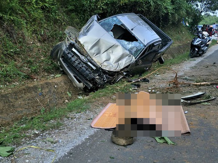 Tại hiện trường chiếc xe bán tải bị hư hỏng nặng, nhiều mảnh vỡ tung tóe ra đường.