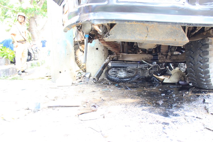 Vụ tai nạn làm anh Lê Phúc Chinh (19 tuổi, sinh viên năm nhất Đại học Hàng Hải) và một người hành nghề xe ôm đang đậu xe bị thương phải đi cấp cứu. Hai xe máy bị cuốn vào gầm hư hỏng nặng, đầu xe ben cũng bị biến dạng.