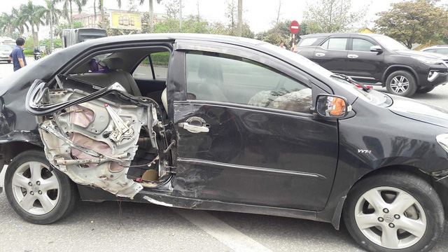 Tại hiện trường, chiếc xe ô tô biển xanh bị vỡ nát phần đầu, nhiều mảnh vỡ bị rơi vương vãi ra đường, lật nghiêng, chắn ngang trên đường. Túi khí cả hai chiếc xe đều bung.
