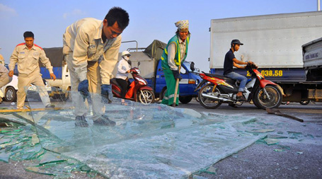 Mới đây, một chiếc xe tải chở vật liệu kính khi lưu thông qua cầu Vĩnh Tuy (Hà Nội) đã bị lật nghiêng. Toàn bộ số kính trong thùng xe đổ ra đường, vỡ vụn. Theo nhiều nhân chứng, vào thời điểm trên, chiếc xe tải chở kính lưu thông qua cầu Vĩnh Tuy theo hướng Gia Lâm vào nội thành. Trên thùng xe, nhiều tấm kính được buộc dựng đứng vào một khung sắt ở giữa thùng.