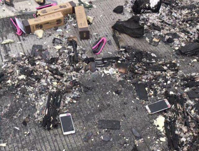 Hình ảnh iPhone và phụ kiện nằm la liệt trên đường cùng chiếc xe cứu hoả đang hỗ trợ dập lửa. Ảnh chụp từ màn hình FB |
