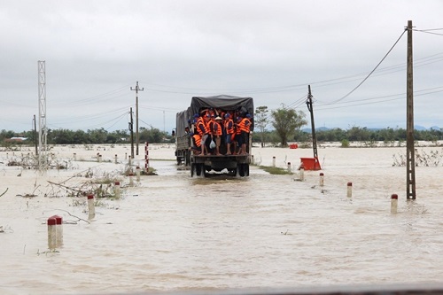 Một con đường dẫn vào xã Quảng An chìm trong nước lũ. Ảnh: Công An Nhân Dân |