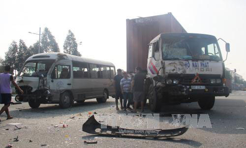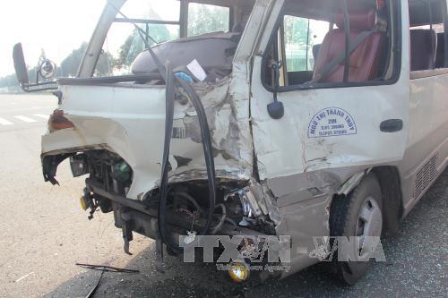 Xe đưa đón công nhân bị hư hỏng nặng phần đầu. Ảnh: Dương Chí Tưởng-TTXVN |