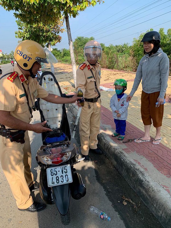 Kem theo dòng chia sẻ này là hình ảnh 2 chiến sĩ CSGT đang hút nhiên liệu từ xe ra một chai nhựa rồi đổ vào bình xăng xe máy cho người phụ nữ. Hai mẹ con cậu bé hẳn là mừng biết mấy khi được "cứu" đúng vào lúc không biết nhờ cậy ai.