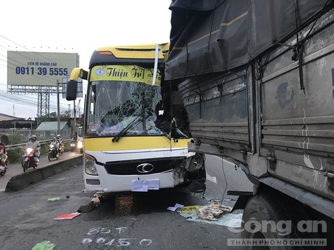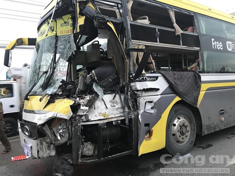 Xe khách bị hư hại nghiêm trọng sau vụ va chạm. Ảnh: Công an TP.HCM |
