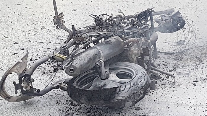 Chiếc xe máy bốc cháy ngùn ngụt ở Đà Nẵng. Ảnh: Dân Việt |