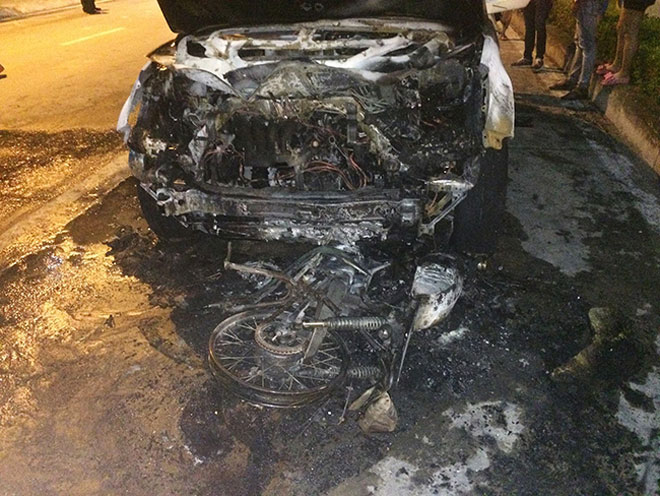 CRV bị lửa thiêu rụi phần đầu, chiếc xe máy cháy trơ khung - Ảnh: báo Dân Việt |