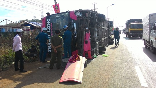 Xe khách giường nằm chạy tuyến Bắc-Nam đến địa phận Đồng Nai trên đã đâm vào dải phân cách khiến xe lật giữa quốc lộ làm 7 hành khách bị thương.