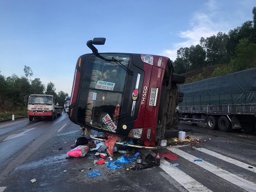 Tại hiện trường, chiếc xe khách lật nghiêng, hư hỏng nặng, cửa kính vỡ nát, khiến nhiều hành lý, đồ đạc của hành khách rơi vương vãi ra đường. Chiếc xe sau khi bị lật nằm gác lên giải phân cách giữa đường.