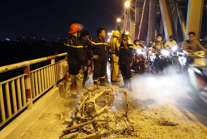Xe máy Attila mang BKS 29S3-0469 cháy trơ khung trên cầu Chương Dương. Ảnh: Báo Tiền Phong |