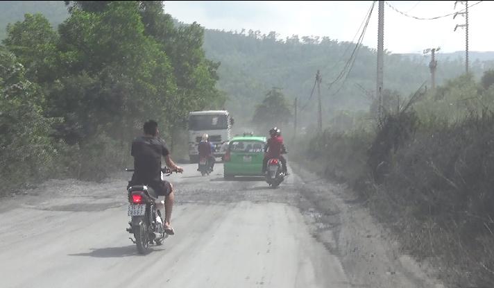 Cứ mỗi lần xe tải chạy qua là kéo theo bụi bay mù mịt. |