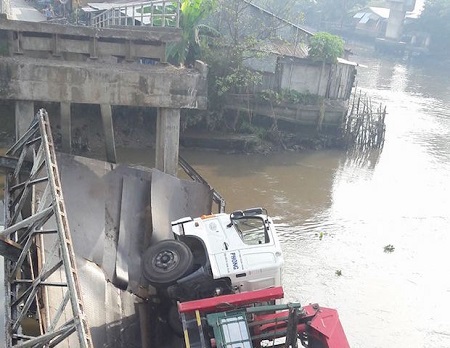 Xe ép cọc chở hơn 15 tấn lưu thông qua cầu trọng tải 5 tấn ở Đồng Tháp. Do quá tải nên cây cầu bị gãy đôi, phương tiện lao xuống thẳng xuống sông.