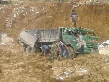 Chiếc xe tải chở vật liệu bị lật xuống lòng hồ khiến tài xế tử vong (Ảnh: báo Giao thông) |