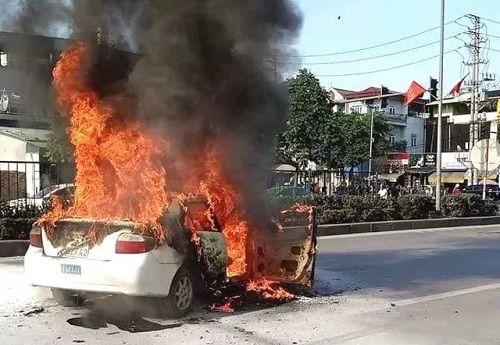 Ngọn lửa phát ra từ khoang máy và bao trùm chiếc xe, 2 người trên xe kịp thời lao ra ngoài thoát thân.