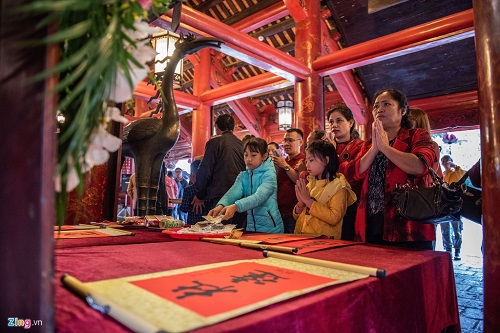 Sau khi nhận chữ từ ông đồ, người xin sẽ mang chữ vào Nhà Đại Bái trong Văn Miếu để cầu cho mong ước từ những con chữ thành sự thật trong năm 2020. Ảnh: Zing |