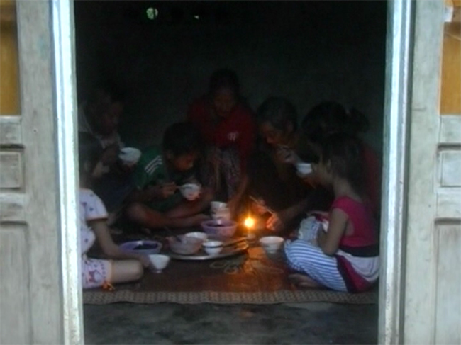 Dù mới 5 giờ chiều, nhưng vợ ông Nguyên đã chuẩn bị xong bữa cơm tối. Cảnh tượng ăn cơm trong không gian tù mù đã trở nên quá quen thuộc với những người dân nơi đây.