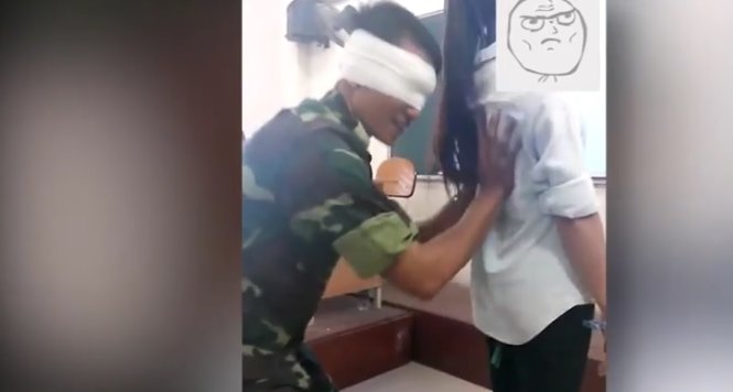 | Thầy dạy quân sự bịt mắt sờ nữ sinh - Ảnh chụp từ clip. |