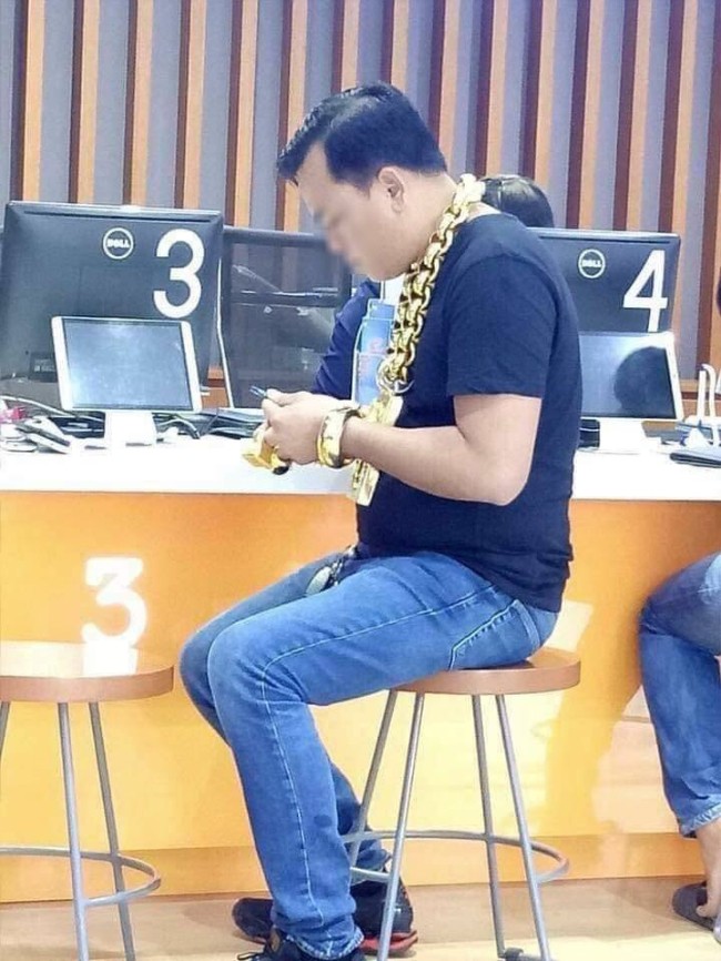 Những ngày gần đây mạng xã hội lan truyền bức ảnh một người đàn ông đeo đầy vàng trên người xuất hiện tại một cửa hàng điện thoại tại Thành phố Hồ Chí Minh.